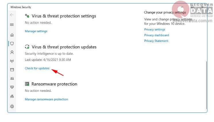 Bước 4: Chọn Check for updates để kiểm tra các bản cập nhật bảo mật. Nếu chưa cập nhật, Windows sẽ tự động quét tìm phần mềm bảo mật mới nhất từ máy chủ của Microsoft và tải xuống các bản cập nhật cần thiết.